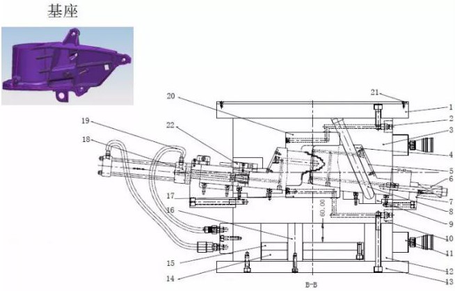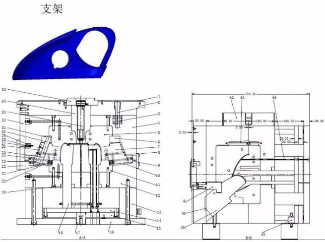 本模具采用推桿+推塊+推塊推出的脫模機(jī)構(gòu),這是汽車后視鏡支架模具的典型結(jié)構(gòu),設(shè)計本類模具要注意,這種結(jié)構(gòu)必須是手工
