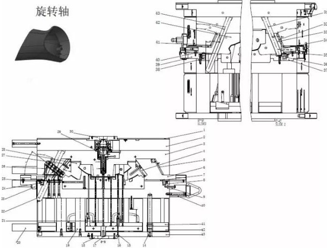 本模具采用推桿+推塊+斜推塊推出的脫模機(jī)構(gòu),這是汽車后視鏡鏡殼模具的典型結(jié)構(gòu),設(shè)計本類模具要注意,這種結(jié)構(gòu)必須是手